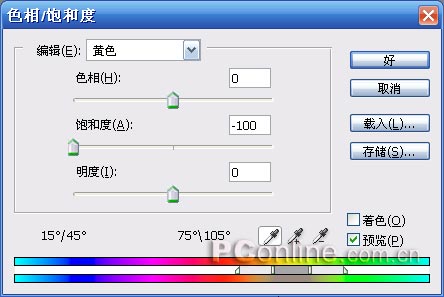 图02 3.使用色相/饱和度工具调整黄色的饱和度(快捷键Ctrl+U)。选择饱和度值为-100。点击“好”按钮。(图03)