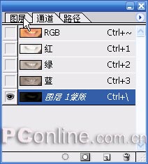 图07 8.在通道面板中,显示“图层1蒙板”,隐藏“RGB”通道。选择“图层1蒙板”并粘贴(Ctrl+V)。(图08)