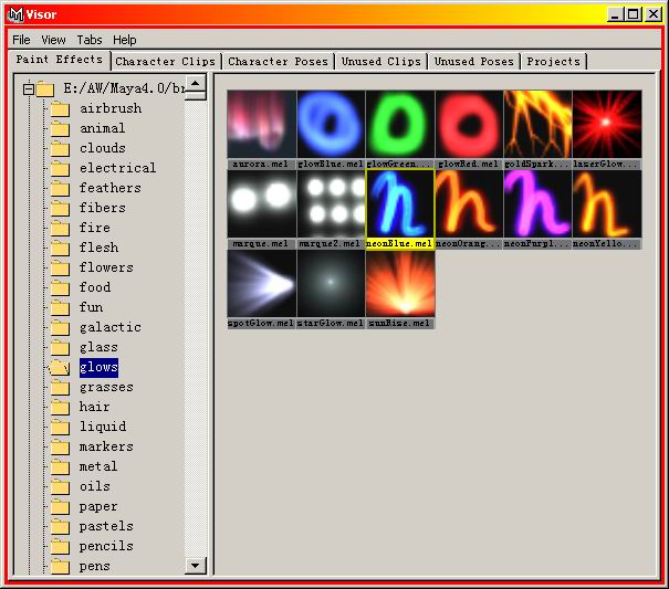 选择curves1,选择windows-general editors-visor 打开visor笔触面板,在visor面板里面选择glows里面的neonblue