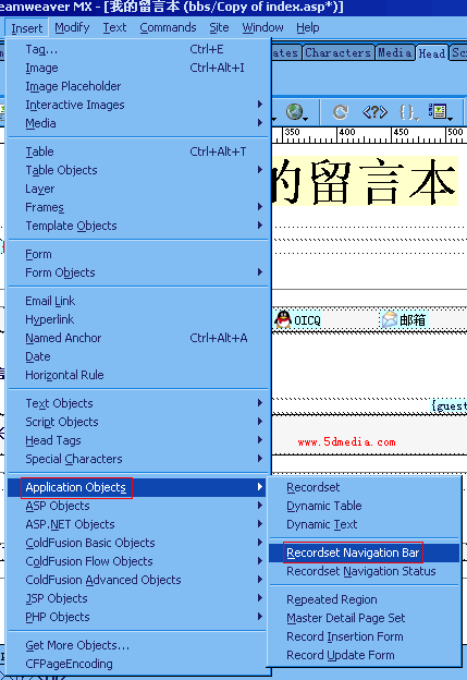 做好上面这三步后还要记得做一件事哦,如果我们留言内容有很多条怎么办??这里要用DW MX服务器行为中的Repeat Region(重复区域),选中显示留言的整个大表格,Application-->Server Behaviors-->Repeat Region,如图(7-26)所示。