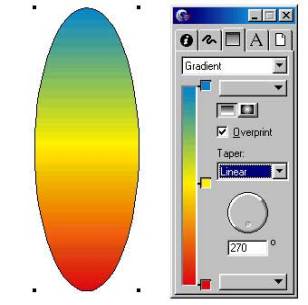 来简单应用一下先:绘制一个圆形;在Fill面板的填充方式菜单中选择Gradient项;在Fill(渐变)面板中选择线性填充按钮,设置为红色/黄色/绿色渐变,实现效果。