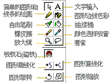 工具栏下面就是工作区了,在工作区的左边是工具箱,里面有许多的绘图和修改工具,跟Windows中的画图差不多,要求记住黑“箭头”工具,它是用于选择图形的,里面还有两个瓶子,要区分开,左边的“墨水瓶”工具是用来给铅笔和直线喷颜色,右边的“油漆桶”工具用来给圆和框内部填充颜色(必须要封闭),也给刷子喷色,使用时一定要多注意,不要搞反了,工具下边还有放大镜和手形双击手可以自动调整工作区;