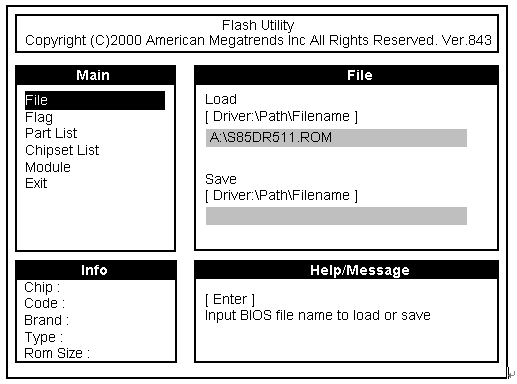 3. 在出现下图介面后按照屏幕提示输入BIOS文件所在的路径及文件名,然后按“Enter”键确认后刷新BIOS,也可以在“Save”栏内保存当前BIOS,输入要保存的路径及BIOS文件名即可。
