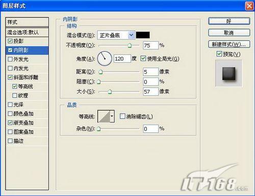 9、双击文字图层,在弹出的图层样式对话框中选择“投影”、“内阴影”、“斜面和浮雕”、“等高线”、“渐变叠加”样式,设置参数如图12-16所示,图像效果如图17所示。